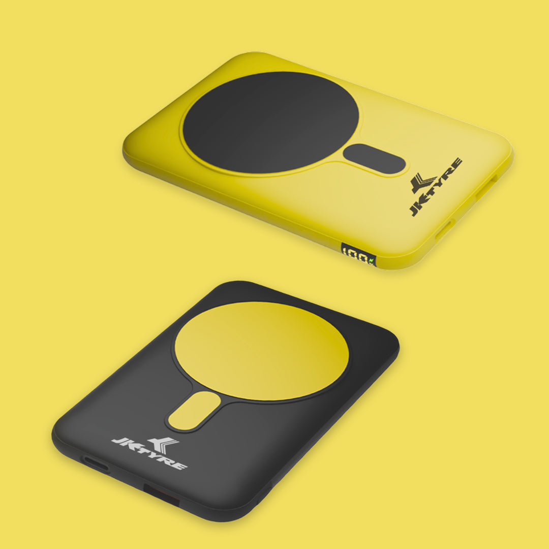 We've crafted MagSafe power banks and mini speakers featuring rubberized textures and JK Tyre's signature yellow and black colors, seamlessly blending functionality with brand identity.