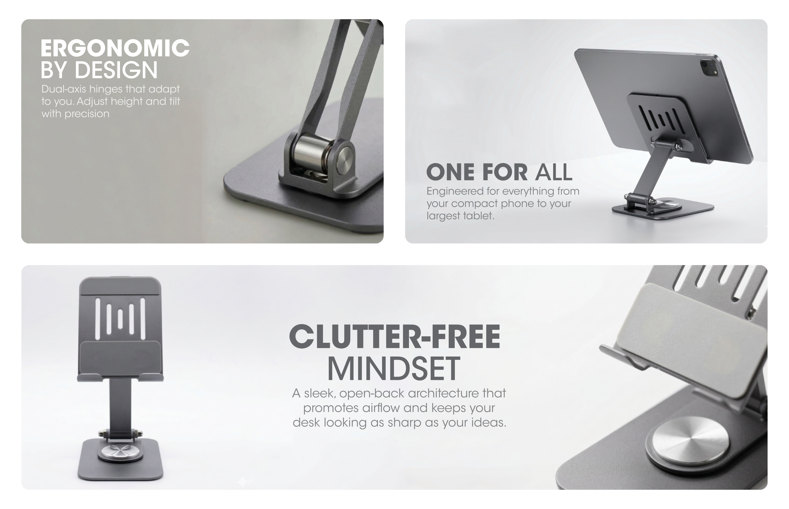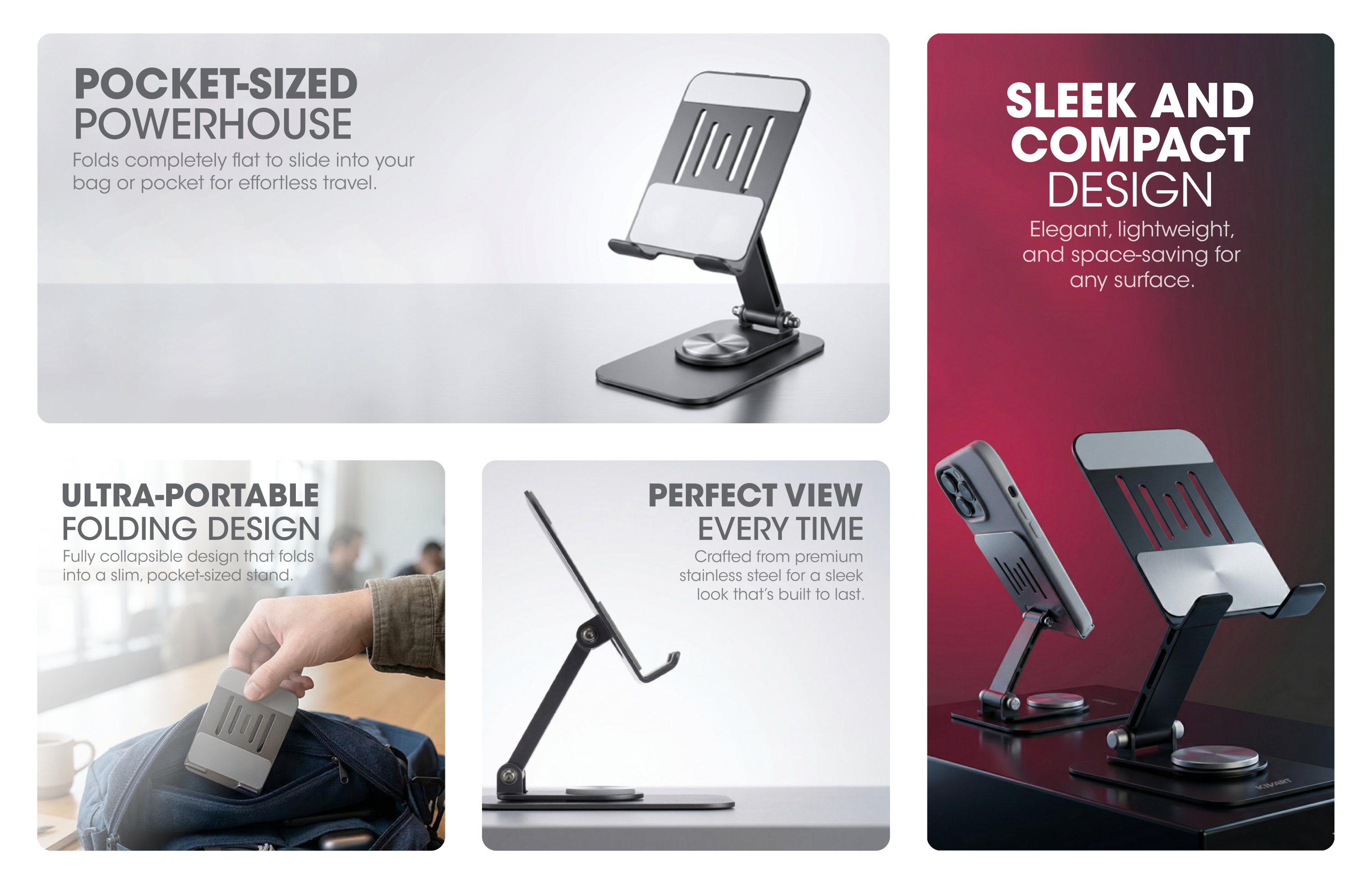 Comfortable angle view, phone stand with pure stainless steel finish. Provided with rubber grip for better sturdiness of mobile Universal compatibility. 360° rotation of the stand. Angle adjustable.